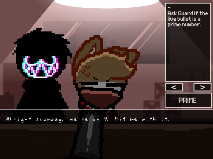 Yeah me neither anyways End Of The Line, the hottest new game on the market- actually let me rephrase that I'm making this sound too spicy. It's not smut. End Of The Line is a poorly named "STRATEGY" game that you could argue doesn't include strategy. You're stuck in a room with a pretty lil' thing, and because you canonically cannot handle the attention of women your main goal is to kill them (before they kill you.) The time until she's aware of the correct boolet varies with the questions you ask.